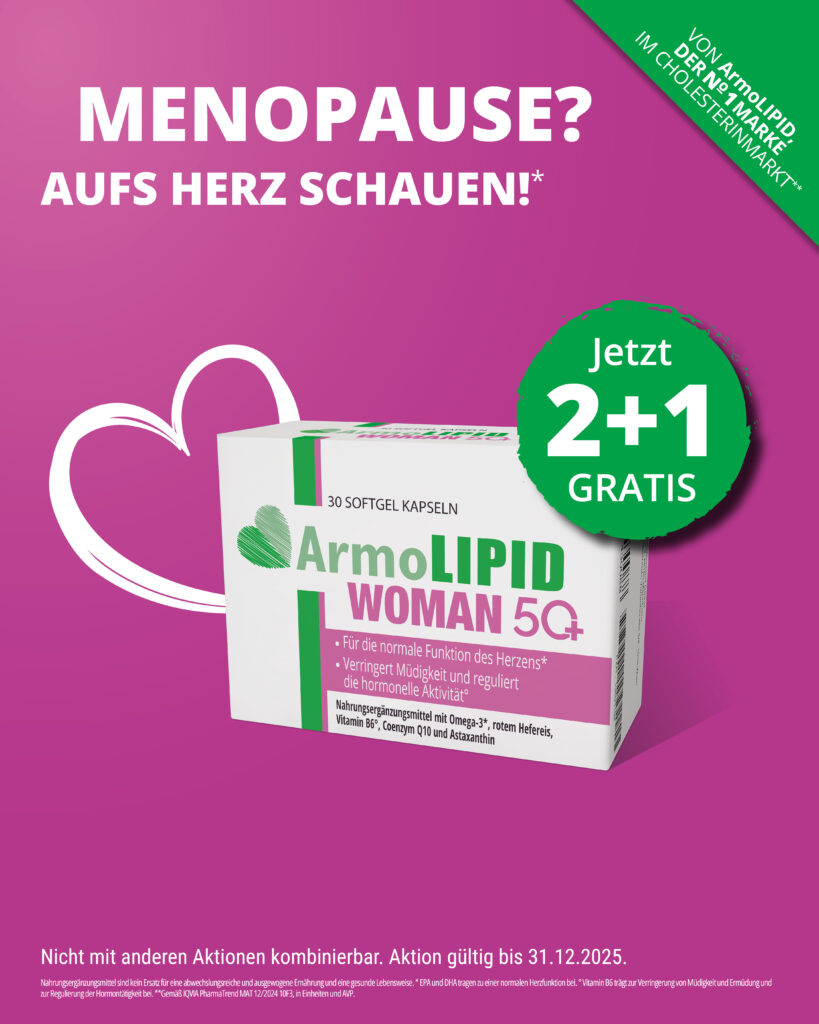 Armolipid – 2+1 gratis gültig auf Armolipid Women 50+ Aktionszeitraum: gültig bis 31.12.2025 Weiterlesen »