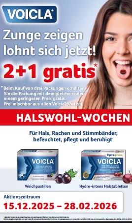 Voicla: 2+1 gratis! 2+1 gratis, gültig auf alle 7 Produkte Aktionszeitraum: 15.12.25 – 28.02.26 Weiterlesen »
